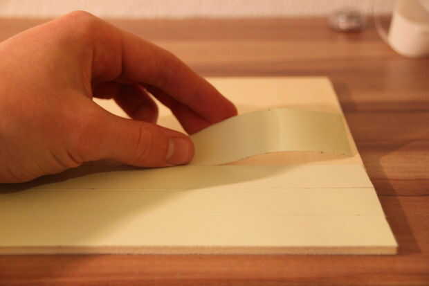 Klebe ALS Nächstes die Streifen dicht aneinander auf das Brett. Wenn du bist de fertig, kannst du die Oberfläche mit Reinigungsalkohol sauber machen.