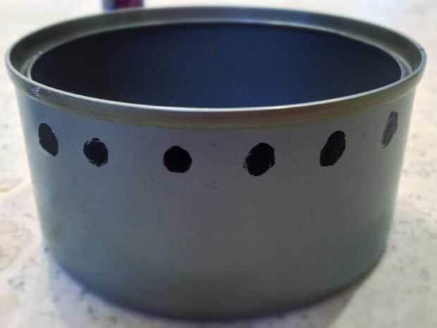 Depende mucho de cómo y qué tan bien se quema su combustible, debería poner más o menos agujeros. Los agujeros más, más incluso el bote de calor, pero su llama no es lo suficientemente fuerte como la costumbre de la llama de ser capaces de llegar por todos los orificios. Menos agujeros, cuanto más lejos las llamas va a tirar, calentar la olla mejor. Así que empezar con menos agujeros, agregando más hasta que las llamas disparar hacia fuera tan lejos como en el cuadro principal.