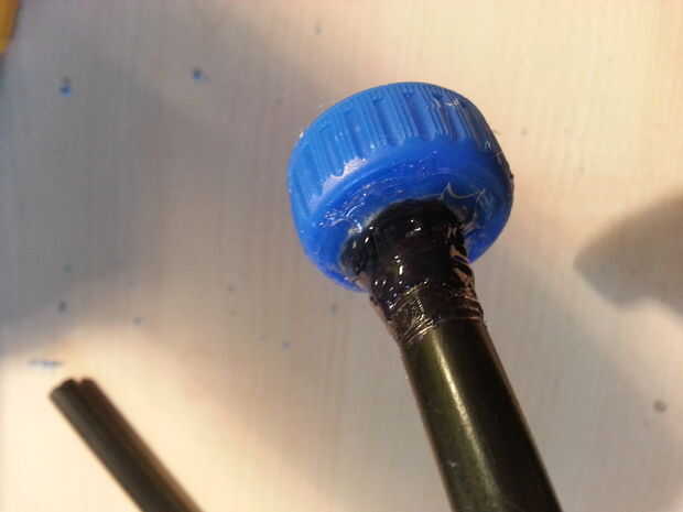 Poner el tubo en la tapa y añadir algunos pegamento caliente para que sea apretado.
