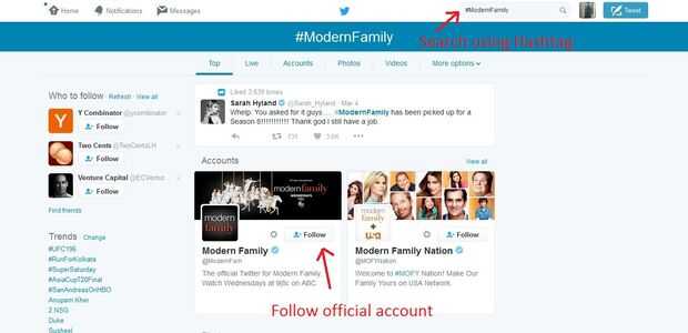el público sabe más sobre ellos y también facilitar la comunicación directa con los fanáticos. La forma más común para buscar el programa de televisión es a través del hastag. Ir a la barra de búsqueda en la parte superior derecha y escriba el nombre de su programa favorito, precedido por hashtag - tal #modernfamily.