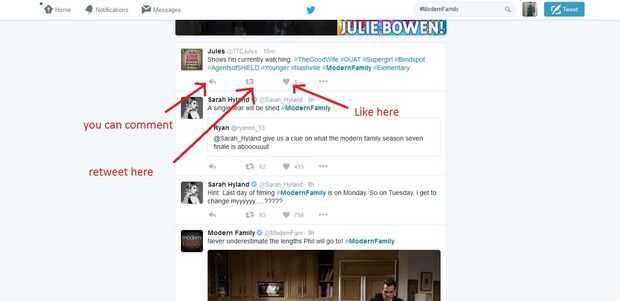¿Visto ese icono de corazón encantador por debajo de los tweets? Bueno, si realmente te gusta un tweet sobre Modern Family o cualquier otro programa, usted puede hacer clic en ese icono para mostrar su gusto al mundo.