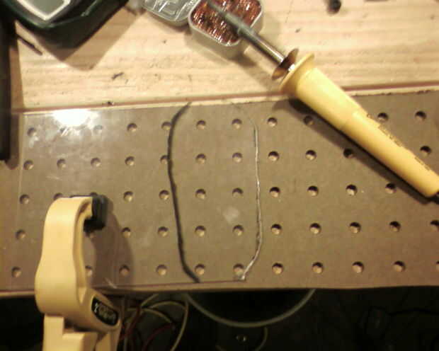 Corte la hoja (plexiglas o aluminio). Utilicé un soldador caliente barato, ya que el mandril se desnuda en mi imitación de Dremel. Si utilizas una Dremel, recomiendo el aditamento de fresadora con una broca de corte. Lijar los bordes lisos, que usted no quiere extra primeros auxilios en la pista.