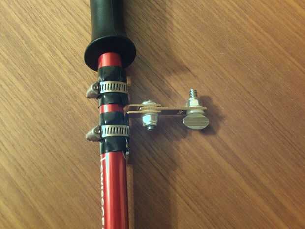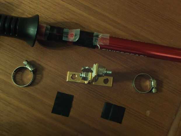 Deslice la abrazadera de la manguera hasta la manija, luego coloque el soporte sobre el material de empaque para que el Monte se está pegando a la izquierda (derecha si te queda entregado) lado de la manija (desde la 1 º persona), coloque una de las piezas de la Junta sobre la brida superior, deslice la abrazadera manguera sobre él y apretar lo suficiente para mantenerse. Repita para la mitad inferior y ajuste hasta que el Monte esté en el lugar correcto. Ahora apriete las abrazaderas de manguera el resto del camino, pero no tan fuerte que corre el riesgo de abollar su poste trekking.