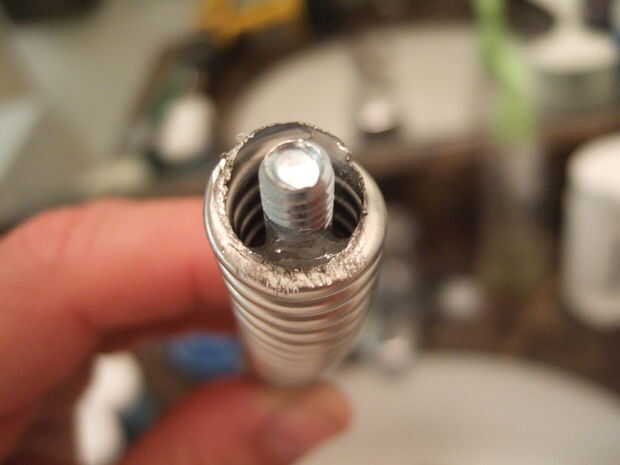 Una vez que sientes que tienes la cantidad correcta de fuera del hilo de rosca, de epoxy el perno y la arandela en su sitio. Coloca un poco de epoxi, dejar secar, luego llena el resto de la cavidad para evitar desorden. Por supuesto más tarde me di cuenta de que yo debo haya enchufado solo el conducto por debajo el tornillo (ver siguiente paso)