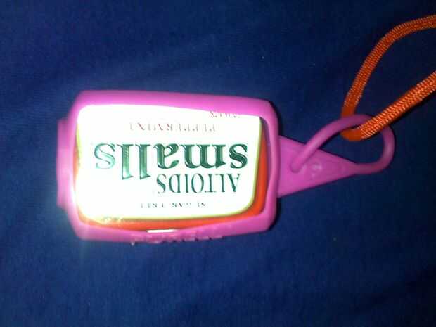 5. kit mini Altoids Smalls (sostenido por la caja del silicón para botella de Purell. (tiene curitas, alcohol toallitas, toallitas húmedas, kit de costura)