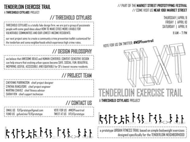 Nota: Para el Festival de prototipos de calle mercado, todas nuestras estaciones de ejercicio fueron situados en una zona en la calle del mercado - no es realmente un camino, pero tenía sentido para nuestro evento. Elegimos crear un folleto informativo del fondo ofrecido en nuestro proyecto, un mapa del barrio de lomo y diagramas del ejercicio. Diseñamos el flyer como un entrenamiento de bricolaje, para que los participantes festival podrían diseñar su propio sendero de ejercicio y entrenamiento. La gente le gustó! Terminó de imprimir y distribuir volantes sobre 1.000 personas llevar a casa y usar en su propio (ya que todos estos ejercicios pueden realizarse en cualquier lugar, con ninguÌ n equipo necesario.