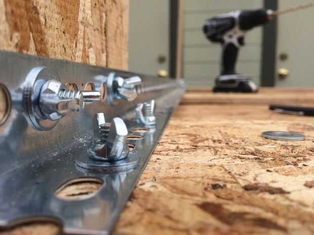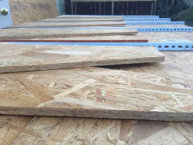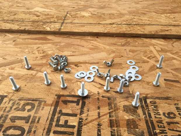 Una vez que se cortan las secciones de OSB y los orificios marcados y perforados, usted querrá fijar los postes de soporte de metal para las secciones de OSB con hardware simple. Hemos utilizado tornillos, tuercas y arandelas y tornillos o clavos también funcionaría.