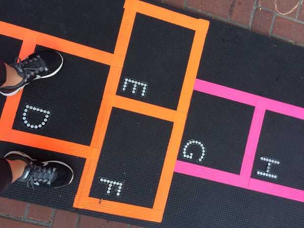 Usted querrá descargar todos los suministros, disponerlos en los lugares deseados y luego aplique la cinta del conducto (de lo contrario empieza a la arruga y pelar). Se utilizó un marco clásico Rayuela, un gran 'X' para los ejercicios de salto y más pequeña 'x' formas para indicar dónde poner los pies. También se podrían utilizar una forma de huella, puntos, líneas u otros iconos juguetón. Luego conectamos cada estación de ejercicio con una línea punteada de la cinta del conducto, como un 'rastro'.