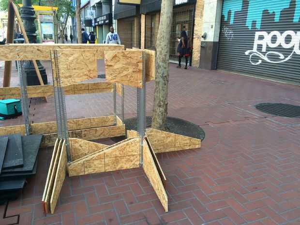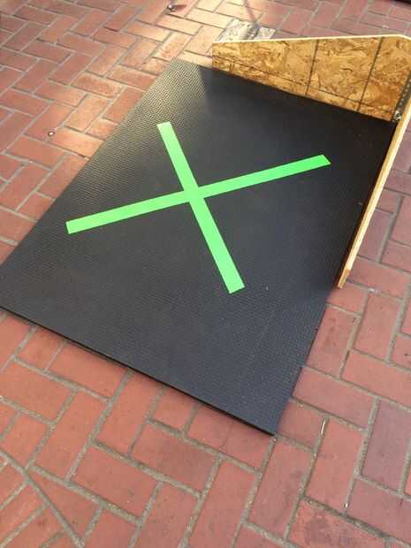 Nota: Para el Festival de prototipos de calle mercado, utilizamos 6'x 4' esteras puesto negro (como para puestos de caballo), cortar por la mitad para hacer dos alfombras de 3'x 4' (para facilidad de transporte). Estas placas sirven de entrenamiento y gimnasios de levantamiento de pesas y proporcionan cojín para actividad física segura como saltar y correr. Para la instalación diaria regular, se recomienda aplicar su cinta/tiza/calcomanías/pintura directamente a la acera (con los permisos adecuados y permite, por supuesto), porque estas parada esteras es probable que 'desaparecer' si a la izquierda hacia fuera permanentemente.