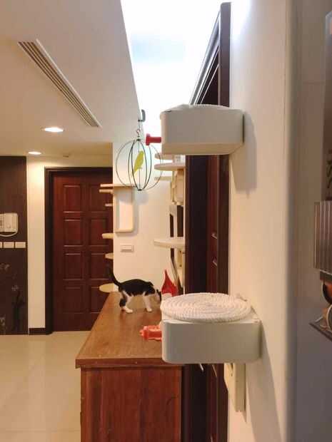 Hemos querido crear un muro de actividad para el cuarto adolescente gato a un refugio de animales local. Querían la pared actuar similar a las paredes de la actividad de cat en el criadero. Se planificó construir cubbies, estanterías y un lugar para
