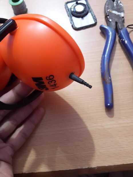 Usar el soldador para hacer un agujero en la base de la unidad de las orejeras. No hacer demasiado. Había ensanchado gradualmente hasta que conseguí su diámetro exactamente el tamaño del manguito de goma.