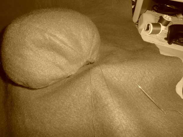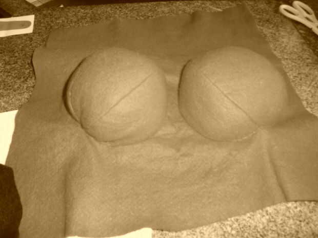 El siguiente paso es sujetar los pechos a la parte superior del cuerpo, en este caso un pedazo grande de fieltro rojo. Colocar los dos pechos de una manera agradable - elegí las costuras ligeramente hacia afuera del ángulo - viró a la pieza base y había cosido a él todo.