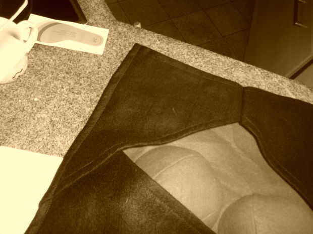 I cortar una pieza rectangular, lo encerrado y agregado a.... bueno... difícil de explicar, y me temo que la imagen no se explicarlo bien. Para tener el vestido más o menos adecuado, dobla la pieza por la mitad y el seqed de 2" a un triángulo en la parte superior. Me aseguré que la costura fue robusto. Luego lo había revelado y aplastado en la forma que ves en la imagen, agregar unos puntos a los lados que lo mantenga lo suficientemente robusta.