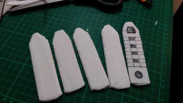 Hice una plantilla rápida de la forma básica. Para ser honesto no quería complicar más esto como va a ser parte de todo el traje y no et tanta atención. También aprendí muy pronto en eso porque si era mi hijo las proporciones del cohete real diseño de booster sería demasiado grande en su pierna y los aumentadores de presión reales le toque casi tocar el suelo.