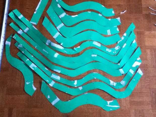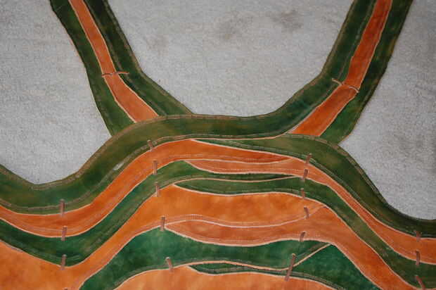 Una vez que lo tienes que colocar todas las piezas de tablero de cerdas lado hacia abajo en el lado equivocado de la piel (que es muy importante!!). Cuando tienes todas las 13 piezas no traslapar puede cinta, trace y corte con unas tijeras muy buenas.