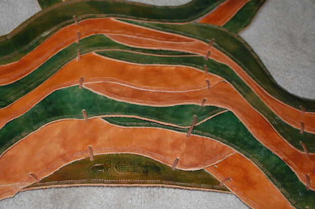 Si quieres teñir o estampar tu armadura, hazlo ahora! Más tarde causará dolores de cabeza. Hicimos un bonito borde celta a lo largo del borde inferior y pares suplentes teñidos marrón y verdes; añade un toque agradable.