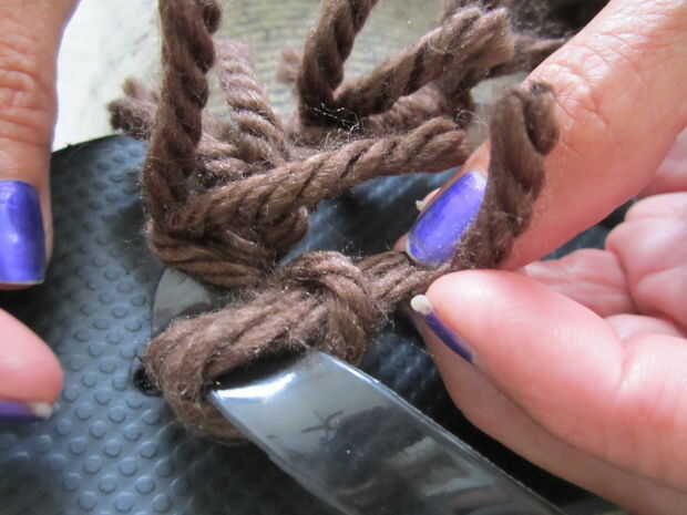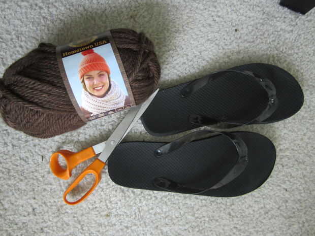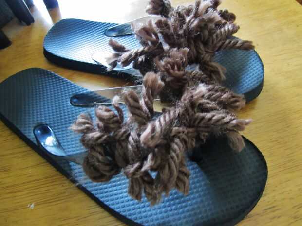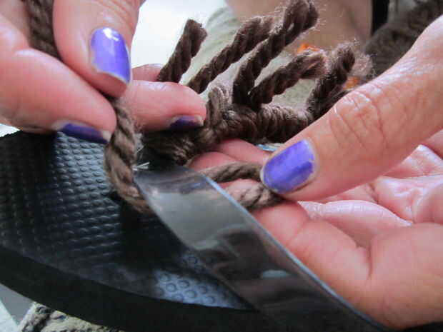 Fracasos de tirón e hilado grueso, marrón son todo lo que necesitas. Cortar un par de longitudes de hilo y luego enrollarlas alrededor en un lazo de estilo de gancho de cierre. Tire firmemente y repita hasta que han cubierto la mitad superior de las correas. Fuzzy el hilo y tratar de reunir a la parte superior del pie tanto como sea posible.