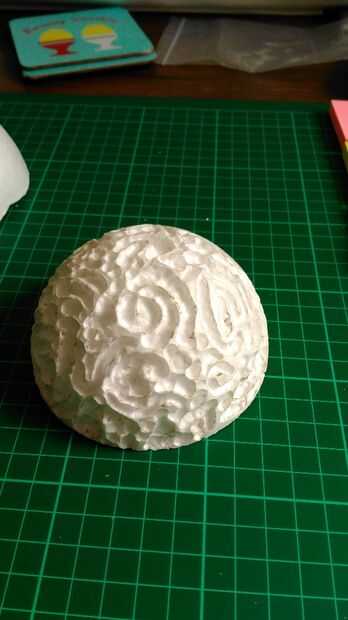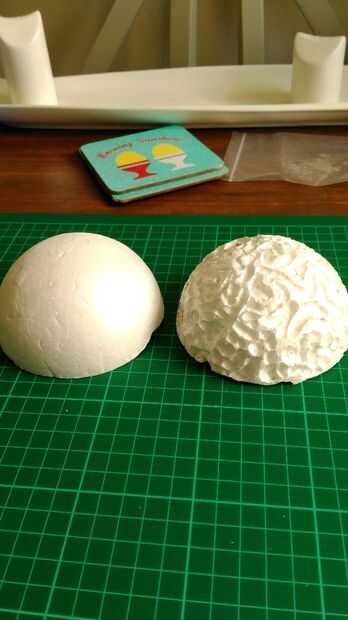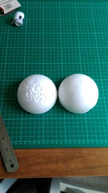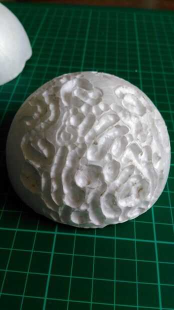 Tome la bola de poliestireno y cortar por la mitad.