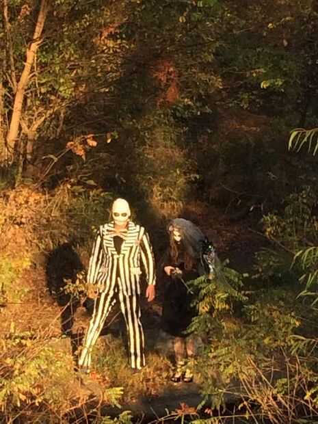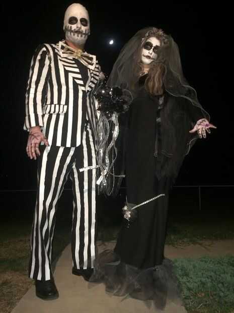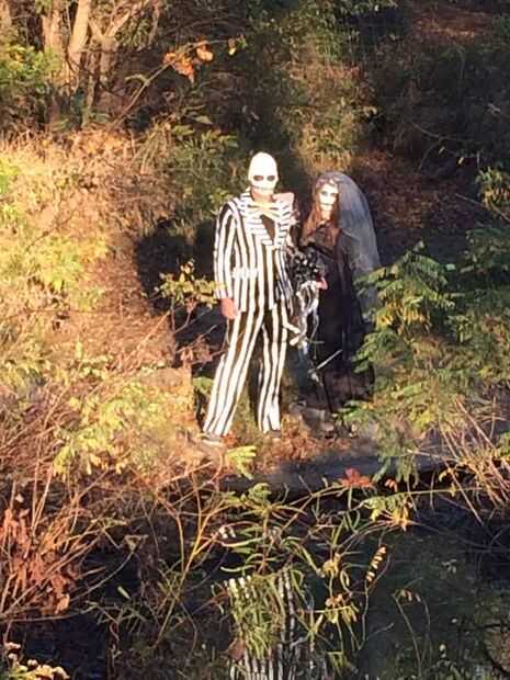 Pajarita – utilizando un viejo negro pantalla portátil puerta que cortamos en una pequeña plaza rectangular y 3,5 pulgadas tiras de cinta adhesiva blanca fue unido a través de la Plaza. El centro de la plaza se reunió y cosido. Cabeza, pies, pierna superior y partes del cuerpo de un esqueleto de plástico fueron utilizadas para adornar el corbatín. 1 franja de pantalla 12 fue cosido a la pajarita para ir alrededor del cuello y un broche de presión grande fue cosida en la tira cosida en la tira para facilitar la extracción.