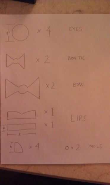 Cortar un rectángulo es el ancho de los rectángulos. La altura debe ser de 4" y luego cortar un surco que se ve como labios. Para las piezas laterales de los labios, que deben ser un círculo cuarto mismo diámetro como la altura (~ 4") y 4 de ellos total superior e inferior. El pedazo de centro de la parte inferior de los labios debe ser un rectángulo de la misma las medidas de la parte superior. Los labios deben ser pintados de rojo.