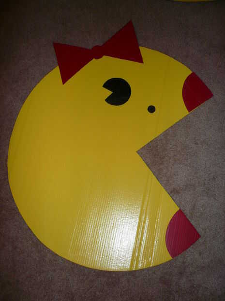 Organizar todas las piezas cortadas, pintadas, donde debe ser colocados en los círculos. Esperar para pegar el interior piezas de rectángulo y labio en los rectángulos interiores. Pegar cada pieza firmemente a los círculos con la pistola de pegamento caliente. Tenga cuidado de no tener un exceso de pegamento sobre la superficie pintada de la ruina.  También la pajarita en PacMan puede colocarse en la parte inferior, dondequiera que usted tenga gusto en dos círculos, preferiblemente en el mismo lugar. Los ojos deben colocarse sobre en el centro de las piezas circulares pero sobre el punto del triángulo interior. La raja en los ojos debe ser hacia la parte posterior del traje y enfrente de la boca.