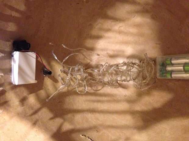 Averiguar lo más bonito para insertar la cadena de luces en la parte posterior del pez. La batería pack consigue caliente pegada en el interior de los peces. Asegúrese de pegar el lado que no se abre, para poder cambiar las baterías cuando sea necesario. Pegue la batería a lo largo de la línea central de los peces para el equilibrio.