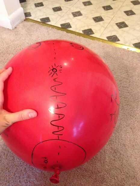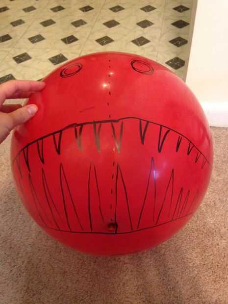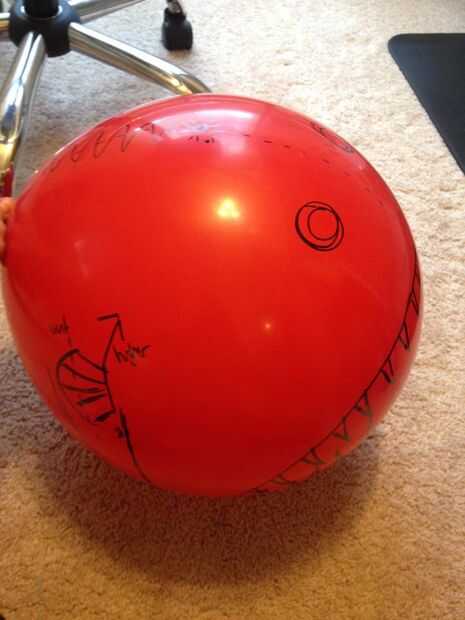 Ahora un rotulador y comenzar a planear su diseño. Me pareció que el pezón-thingy donde la goma había sido unida realmente útil para encontrar el centro del balón. Me di cuenta de más o menos donde podría colocar la boca, ojos, aletas, cola y lugares ocultos para la ventilación. A nadie le gusta la sudorosa cara de máscara.