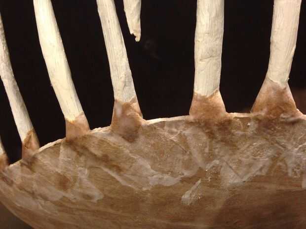 Para ayudar a estabilizar los dientes y hacerlos mira más natural, corte corto, finas tiras de papel: 1/2 de ancho y largo de 2-3 in. Sature cada uno de ellos en pasta de papel maché y luego Envuelva cada diente con una tira en su base. Llevar la franja alrededor del interior del diente, luego cruzar los extremos en la parte delantera para que se superpongan con la boca.