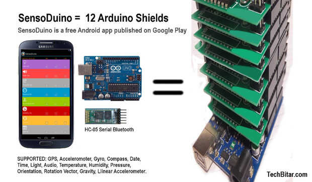 Pensar en SensoDuino como tener más de una docena de escudos virtuales para tu Arduino cada prestación de una función o característica tales como GSM, GPS, giroscopio, etc. pero sin tener que apilar o alambre de estos componentes. SensoDuino es una aplicación Android gratuita que captura datos de sensores integrados en tu dispositivo móvil Android y luego transmite los datos sobre el módulo Bluetooth HC-05 para Arduino Uno o cualquier dispositivo con capacidad de Bluetooth serial como un PC con Windows, Mac, o Bluetooth de microcontrolador. SensoDuino también guarda los datos capturados en un archivo de texto delimitado por comas. Esta aplicación ha sido probada y diseñada para el módulo Bluetooth serie HC-05. Otros módulos de Bluetooth pueden o no trabajar. Ver comentarios de los usuarios que trataron de otros módulos de Bluetooth, con esta aplicación.