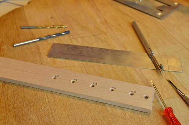 La hoja de madera contrachapada es la base del campo de sensor. Taladre los orificios como en el dibujo. Para cada botón tienes que perforar una grande (3 mm) y una pequeña (2 mm). El pequeño es para el cable del sensor y la grande para el LED de estado. El orificio rectangular es la tierra de la hoja de aluminio.