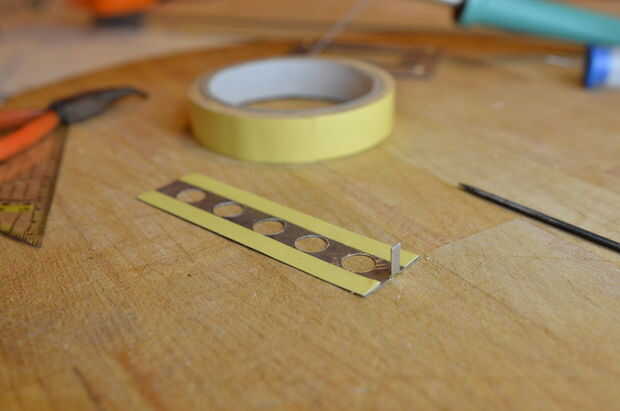 Pegar la placa de puesta a tierra con dos tiras de cinta de doble cara a la madera contrachapada. Preste atención a todos los agujeros en el aluminio y la madera contrachapada del centro correctamente.