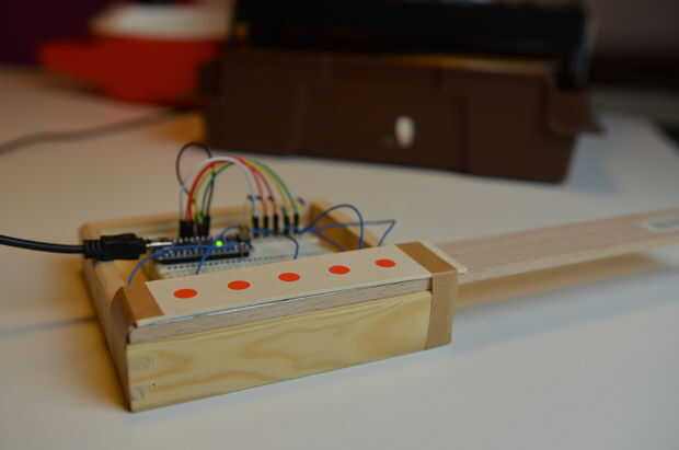 Porque debe ser un campo de sensor capacitivo la cubrí. Para los primeros ensayos del uso un trozo de cartón y algunos puntos rojos para marcar las posiciones del sensor.