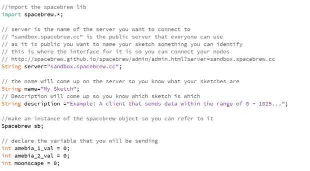 Antes de comenzar Asegúrese de que ha descargado el SpaceBrew Lib y copian en el procesamiento de la carpeta de la biblioteca!!!!!!
