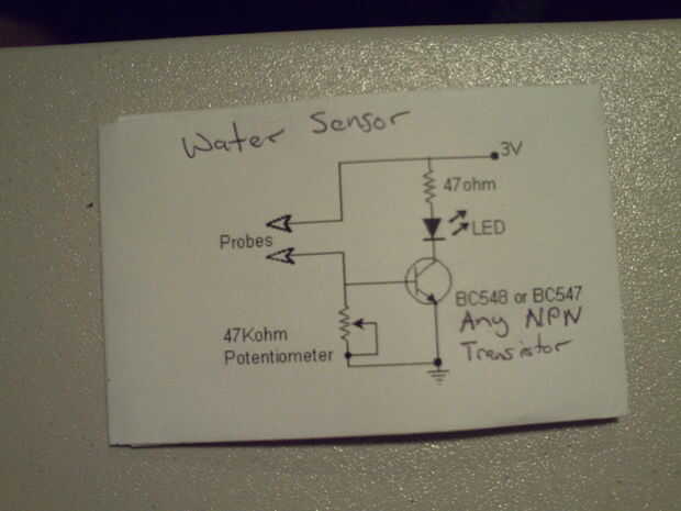 hacer un simple circuito de un sensor de agua mediante el uso de algunos aparatos eléctricos. No confianza sólo compruébalo tú mismo.Son-1) transistor NPN.2) interruptor de.3) resistencia dos 500 ohmios.Resistencias de 10kohms A 4).condensador 5) 0,0