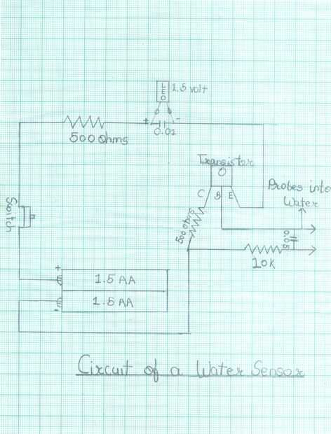 hacer un simple circuito de un sensor de agua mediante el uso de algunos aparatos eléctricos. No confianza sólo compruébalo tú mismo. Son- 1) transistor NPN. 2) interruptor de. 3) resistencia dos 500 ohmios. Resistencias de 10kohms A 4). condensador 5) 0,01. condensador 6) 0,001. 7) un LED (1,5 voltios). 8) una fuente de alimentación de 3 voltios. 9) herramientas básicas
