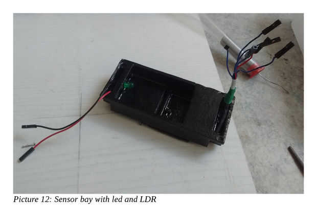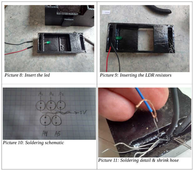 La colocación de los resistores LDR es un poco complicada ya que el espacio es limitado. Ver cuadro 10, el centro de los cables se sueldan juntos a + 5V, los cables del exteriores están conectados a la A1-A5. Acortar la longitud de la LDR y doblar el alambre, véase el cuadro 11. Poner el alambre de cobre en el bucle y trence a ambas partes. Después de torcer soldar el alambre de cobre y el pin de la LDR. Utilice manguera retráctil para proteger eléctricamente los cables pelados. Añadir conectores hembra protoboard y el sensor de matriz está listo.