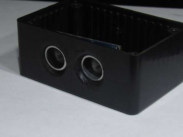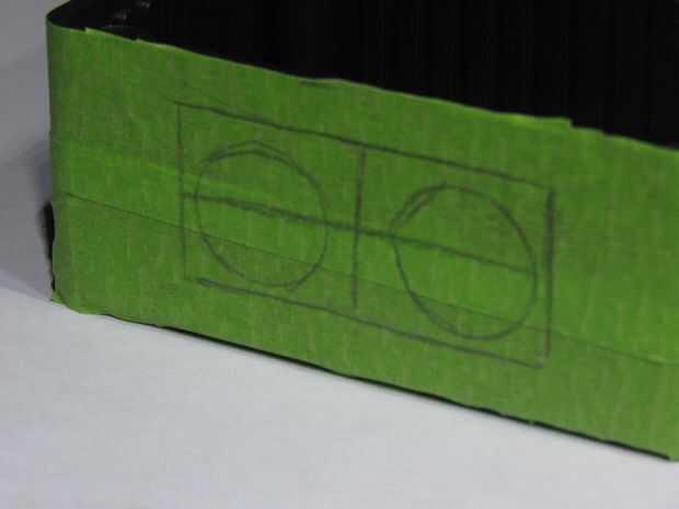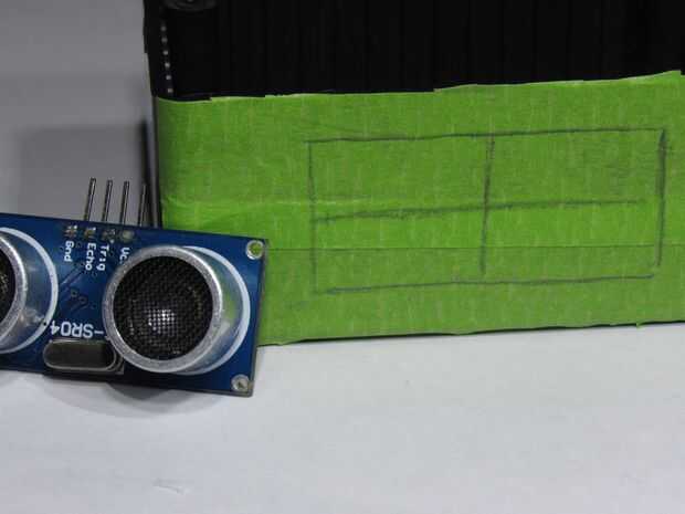 Coloque alguna cinta de pintor en un lado de la caja de proyecto, coloque el sensor ultrasónico sobre él y trazar sobre ella. Ahora, utilice una broca de 16mm para taladrar dos orificios para el sensor. En el lado perpendicular, perfore un orificio de 5mm para el LED.