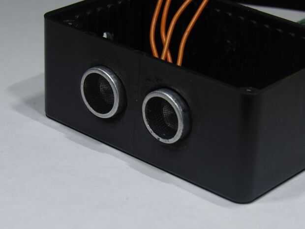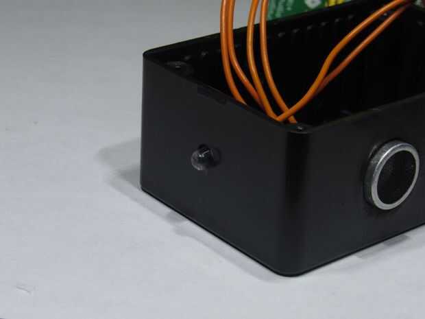 El sensor ultrasónico a los orificios en la caja, entonces el LED al lado perpendicular de la caja del pegamento