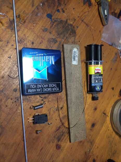 1 x lata de cigarrillos de Marlboro, o una lata de atún cuadrado, cualquier cosa que se puede utilizar para contener el agua 1 x soldadura de varilla o alambre duro 1 x interruptor de palanca que te dará la opción de "off" cuando presiona 1 x pequeño manantial 1 pieza x de madera 1 x pegamento, epoxy funcionó para mí
