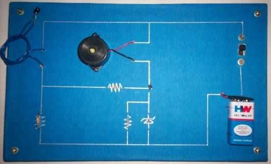 Este voltaje de salida se aplica a un transistor NPN a través de una resistencia. Es mantener el voltaje del emisor de 4,7 voltios con la ayuda de diodo Zener. Este voltaje usaremos como comparar voltaje. Transistor conduce cuando la tensión de base es mayor que el voltaje del emisor. Transistor conduce obtiene voltaje de base más de 4,7 y circuito se completa a través del zumbador y da sonido.