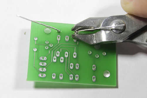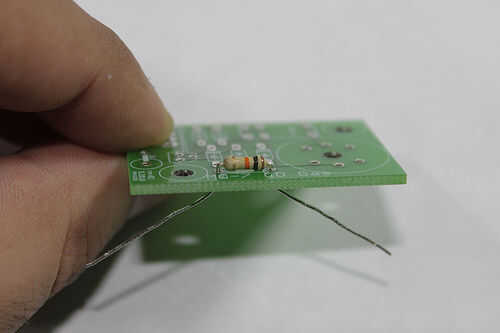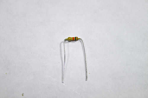 Localizar la resistencia de 10K-ohm.  Este es el que haya franjas leído naranja - negro - marrón - oro.  Doble ambas piernas de la resistencia de abajo 90 grados.  Inserte la resistencia en los agujeros marcados 10 k'.  Soldar las patas y luego recortarlo con las tijeras.