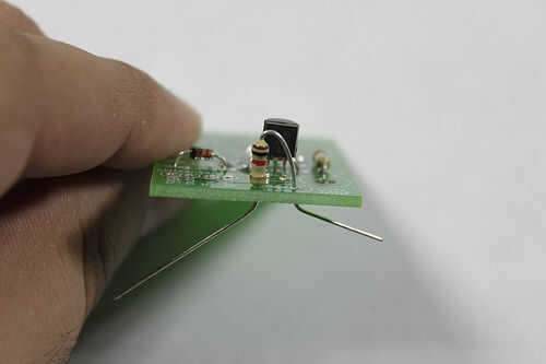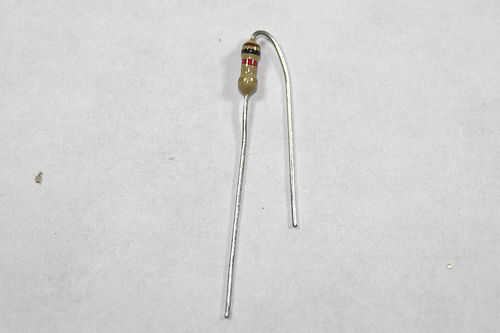 El resistor de 1K ohm tiene rayas que colores leer rojo - negro - marrón - oro.  Una de las patas doblar 180 grados como ves en la imagen.  Introduzca en los agujeros marcados 1k en el tablero. Soldar en su lugar y recorte con tijeras.