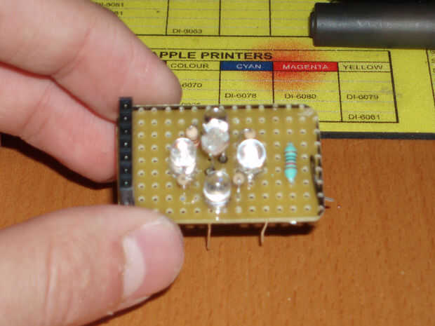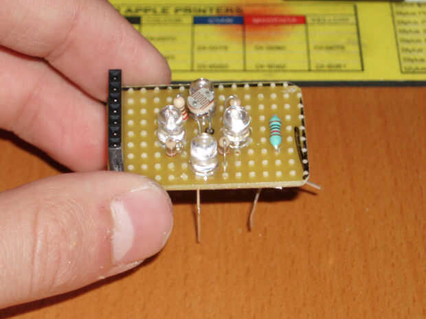 aquí vamos a aprender como hacer un sensor de color. mi modelo consta de tres compartimentos de cartón que contiene un LED - uno rojo, uno azul y uno verde - y un fototransistor de OP550B. Brillo de los LED al mismo tiempo en una tarjeta de color sól