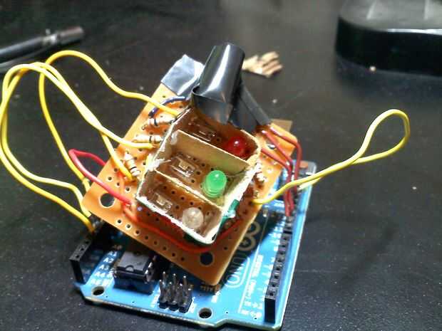 B. Conecte la caja externa a la placa de circuito. Utilicé una pistola de pegamento caliente para hacer esto, pero arcilla u otra opaca, maleable sustancia sería más eficaz para mantener luz hacia fuera.