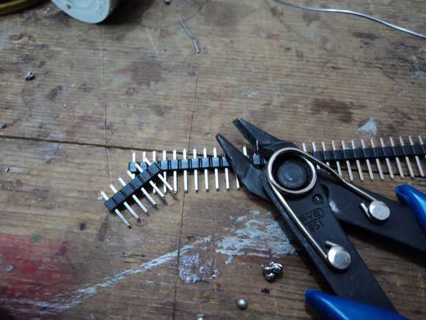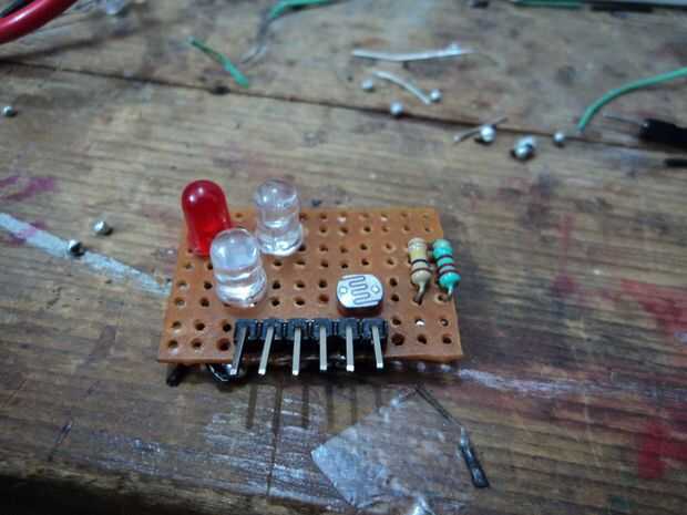 Cortar 6 cabeceras masculinas para perfboard con pinza o herramienta de corte similar y organizar todos los componentes que desee, dejan un montón de espacio solo para LDR. Soory porque en esta imagen había intentado resistor de 100 kilo ohms, pero esto fue sólo un intento, he utilizado resistencia de ohmios 10 kilos!!