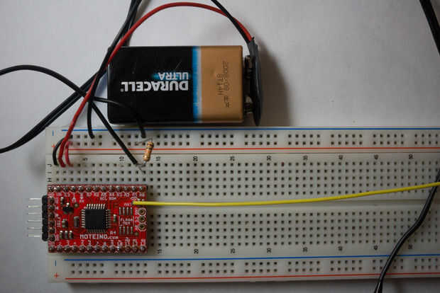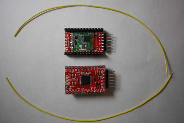 Una vez hecho esto, soldar los pines de la cabecera sobre el tablero de Moteino porque nos va ser enchufar directamente en un protoboard y corte un trozo de alambre en 6,83 (743mm) larga para usar como nuestra antena. Soldadura en el agujero de la antena en el Moteino. Ver las imágenes en esta página y la Página Web de Moteino para la referencia. Una vez que los soldados y con éxito ha interconectado con el Moteino (trate de subir el sketch de Blink con el pin del LED a 9), conéctelo a la placa, conecte la alimentación y la tierra a los buses de la placa y nosotros podemos iniciar detección.