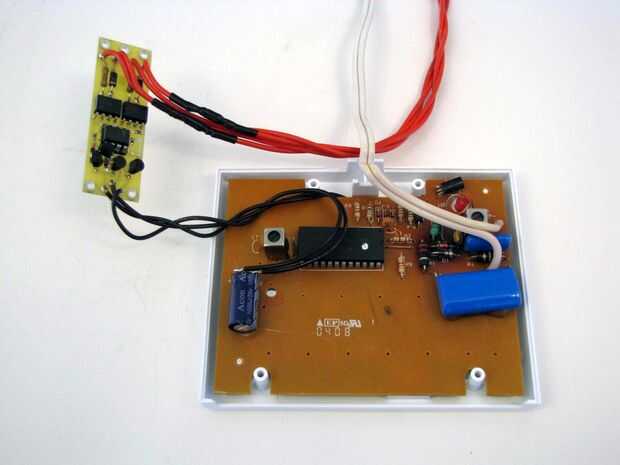 Uso un cuchillo de la manía para cortar una muesca en la parte posterior de la carcasa inferior del controlador mini X-10 cerca de la entrada del cable de alimentación AC de punto para que los cables del sensor AC pueden ser traídos de la caja sin aplastarlos.