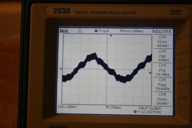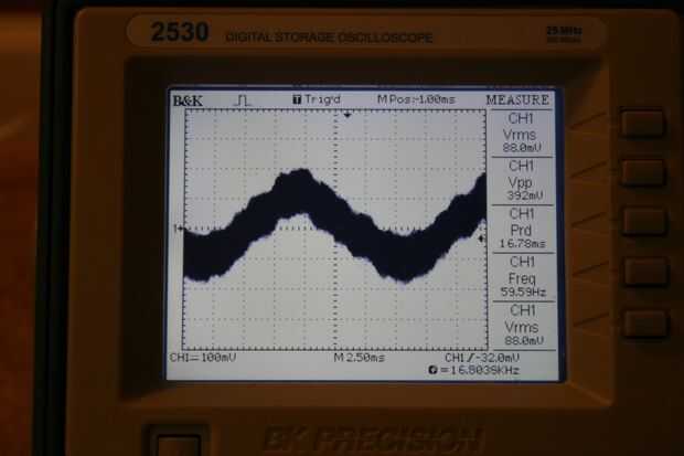 Aquí es lo que creo que está sucediendo. Si conecta un alcance a dos hilos retorcidos (cables trenzados no están conectados eléctricamente), usted conseguirá una onda de 60 ciclos, con un montón de "pelusa" en la onda. Cuando te acercas a los cables trenzados, disminuye la "pelusa". Para eliminar el componente de 60 ciclos de la onda, el tiempo entre la primera y la segunda "digitalRead" declaraciones deben ser un múltiplo de 60 ondas de ciclo (50 milisegundos, 100 milisegundos, 500 milisegundos)
