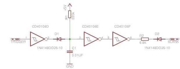 El esconder el circuito mostrado es un circuito simple de multi-vibrador mono estable construido con tres. Puertas de Schmidt-inversor. La salida del circuito blanking tira el umbral de detección bajo correspondiente al requisito de alta señal de ~ 2,5 milisegundos por lo que las distancias de ~ 40 cm son ignorados.