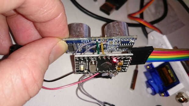 El Arduino se programa a través de una Junta de programación externa que se conecta a través de cables de female↔female. Cada tablero tendrá las clavijas de datos etiquetadas y van a estar en el mismo orden por lo que es una cuestión de asegurarse de que cada lado se engancha encima de la misma manera. Se puede observar que la transmisión (Tx) y recepción (Rx) pernos se cruzan de tablero pero esta esta intencional ya que desea que los pines de recepción para hablar con los pasadores de transmisión para que el paquete de cable irá directamente a través.